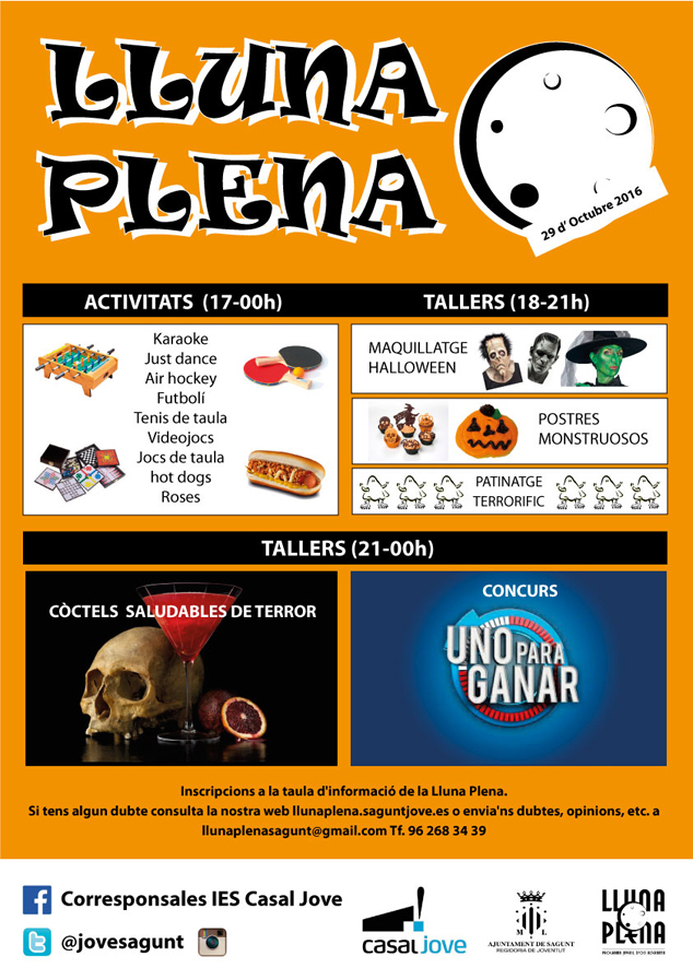 El sábado para l@s jóvenes de los IES y el resto que deseen participar, se ha programado LLuna Plena, un conjunto de actividades desde las 17 horas, y talleres desde las 18 a las 21 horas, así como un concurso que lleva como nombre “Uno para Ganar”. (Todas las actividades y horarios están detallados en los carteles que publicamos).