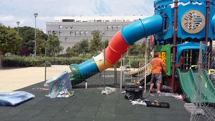 La delegación de Mantenimiento repara los daños de la zona de juegos infantiles de la plaza Juan Pablo II