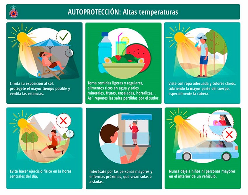 Es recomendable vestir con ropa adecuada y colores claros, cubriendo la mayor parte del cuerpo, especialmente la cabeza. Además, hay que evitar hacer ejercicio físico en las horas centrales del día. Respecto al entorno social, hay que interesarse por las personas mayores y enfermas próximas, que vivan solas o aisladas y nunca hay que dejar a los niños y niñas ni personas mayores en el interior de un vehículo.