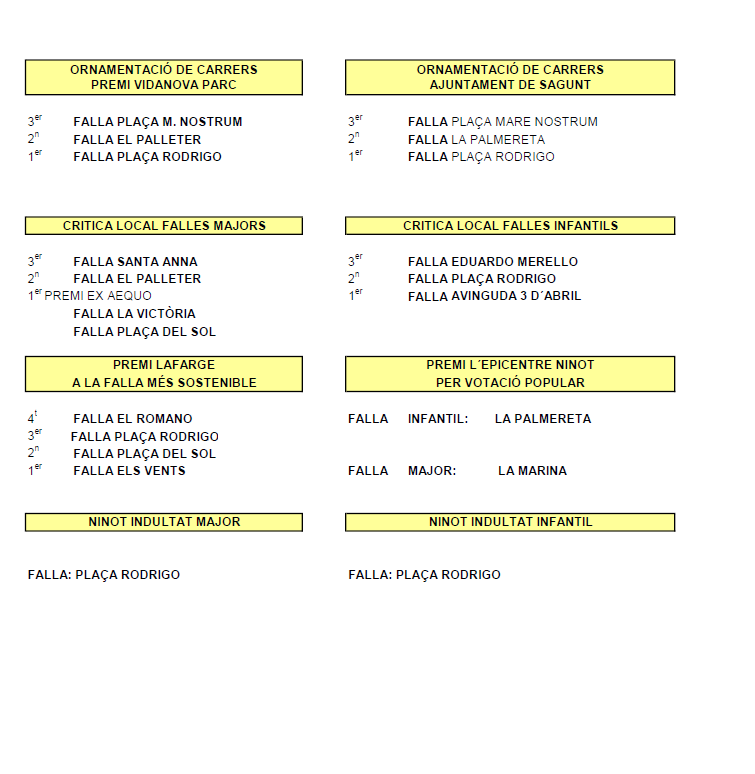 La comisión de la falla Plaça Rodrigo también puede celebrar el premio de mejor ninot indultat major; además, esta misma comisión también se ha alzado con el mejor ninot indultat infantil. La mejor ornamentación de calles ha recaído en la falla Plaça Rodrigo, que ha quedado por delante de La Palmereta (segunda) y de Plaza Mare Nostrum (tercera).