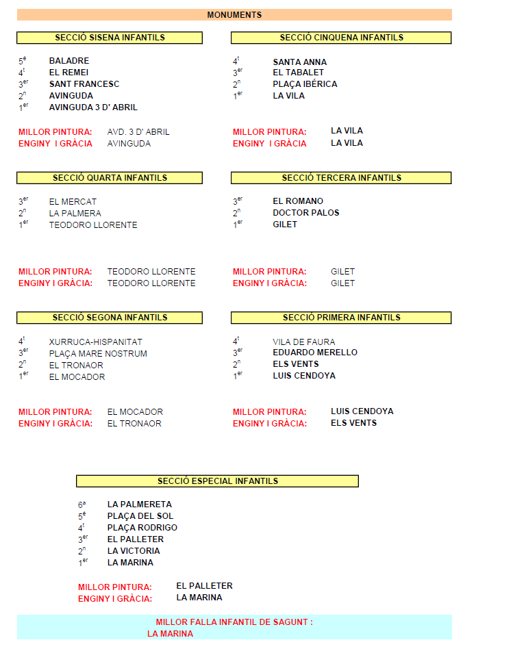 En cuanto a la categoría infantil, la falla ganadora de este año es La Marina, que también ha recibido el premio de Ingenio y Gracia. El segundo premio de Sección Especial ha sido para la falla La Victoria. Por otra parte, el tercer premio lo ha logrado El Palleter, así como el de Mejor Pintura; el cuarto premio Plaça Rodrigo y el quinto y sexto premio han sido para la falla Plaza del Sol y La Palmereta respectivamente.