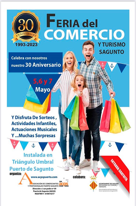La XXX edición de la Feria de Comercio y Turismo se celebrará el próximo 5, 6 y 7 de mayo en el Triángulo Umbral de Puerto de Sagunto. Este evento de apoyo y dinamización al sector comercial, así como de potenciación del turismo en Sagunto está organizado por la Asociación de Comerciantes y Profesionales de Puerto Sagunto (ACPS) en colaboración con la Concejalía de Comercio y Mercados.