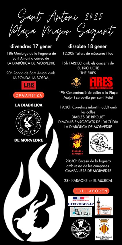 El plato fuerte tendrá lugar el sábado, 18 de enero. Durante la mañana de esta jornada se desarrollarán talleres de máscaras y fuego (12.30 horas). Por la tarde habrá un tardeo con los conciertos de El Trío Liote y The Fires (16 horas). Las collas se concentrarán en la plaza Mayor y harán un pasacalle por la calle Camí Real (19 horas). A continuación, habrá un correfoc infantil y adulto con las collas a cargo de Diables de Ripollet, Dimonis Enroscats de l’Alcúdia y La Diabòlica de Morvedre (19.30 horas).