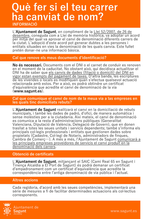 Entendiendo que el cambio de nombre de las vías públicas es una actuación que afecta de forma directa al vecindario y las empresas, por parte del Ayuntamiento de Sagunto se ha previsto tomar las medidas para favorecer y facilitar el proceso de actualización de datos de la ciudadanía afectada por el cumplimiento de la Ley y de esta forma minimizar las molestias que puedan generarse. La adopción de este acuerdo puede generar dudas a las personas y entidades situadas en vías la denominación de las cuales cambia.