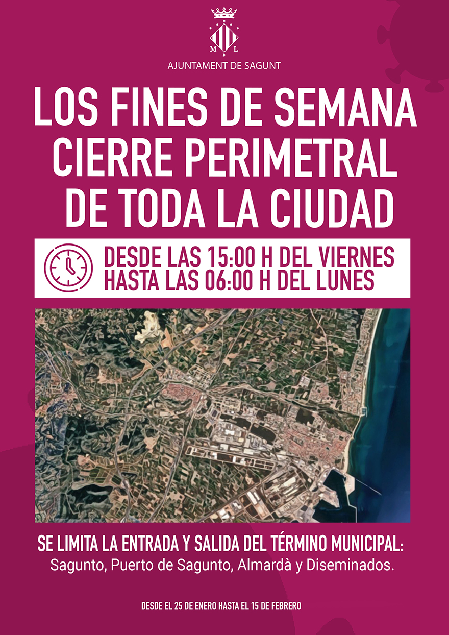 Desde el Ayuntamiento de Sagunto y la Concejalía de Policía Local, y en coordinación con el resto de Cuerpos y Fuerzas de Seguridad, se realizarán controles de vigilancia para el cumplimiento de las restricciones sobre movilidad y confinamiento perimetral ordenado por Presidencia de la Generalitat Valenciana, realizando controles constantes y aleatorios en las distintas vías de acceso a los núcleos de población desde las 15.00 horas del viernes hasta las 06:00 horas del lunes.
