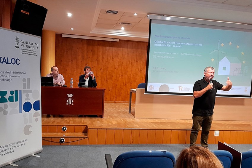 Durante la jornada, han participado como ponentes el director general de Calidad, Rehabilitación y Eficiencia Energética, Alberto Rubio; el director general de Coordinación Institucional de la Vicepresidencia Segunda, Marc Aparici, y el arquitecto de la Oficina Técnica de Fondos Europeos de la Oficina Xaloc de Sagunto, Enrique Sánchiz.