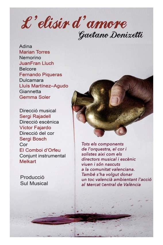 El argumento de L’Elisir d’Amore se centra en la fuerza transformadora del amor. Nemorino, protagonista de la historia, para conseguir el amor de la bella Adina busca la ayuda del charlatán Dulcamara, que dice tener un brebaje que hace enamorar. La acción se sitúa en esta producción en el Mercado Central de València.