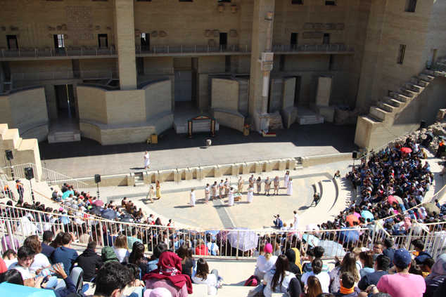 La pompa ha llegado al teatro al son de los instrumentos y, en primer lugar, han entrado los narratores que han dado la bienvenida a los espectadores y han explicado las acciones que se van a desarrollar. El magistrado y su esposa, tras un breve discurso de bienvenida, han esperado sentados para participar de las ofrendas a Pales.