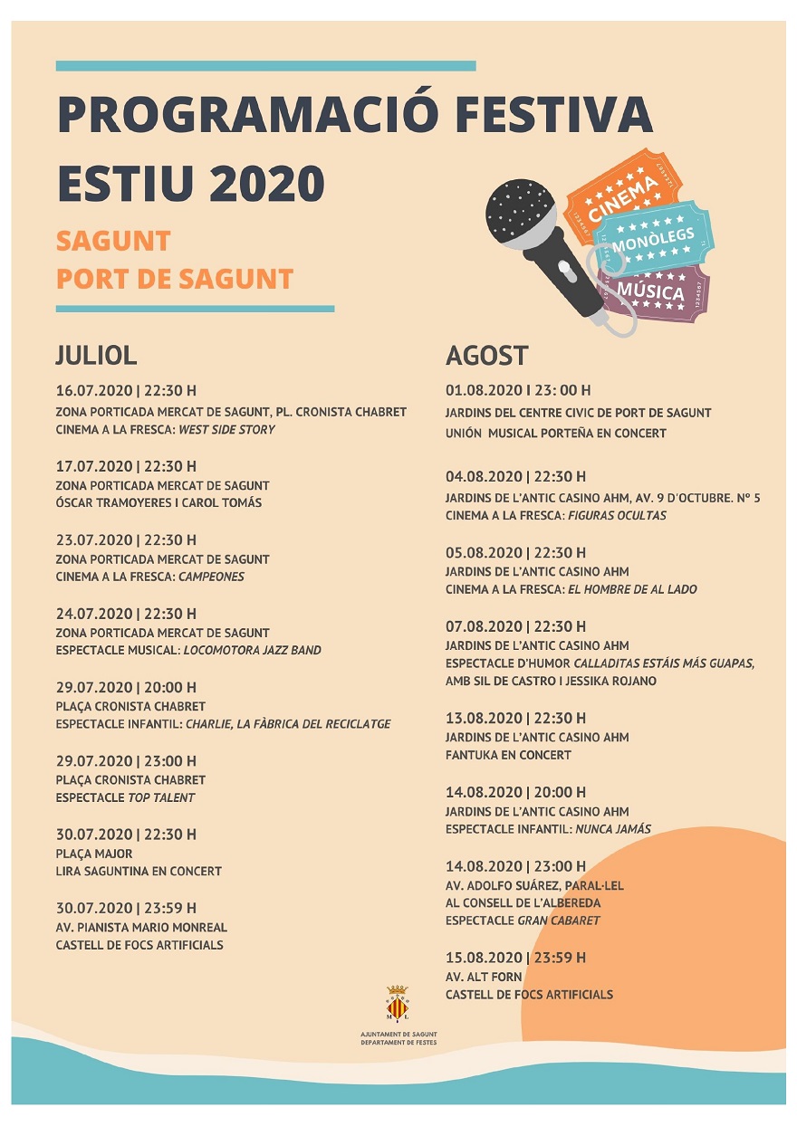 Verano 2020 es la programación festiva que ha organizado la delegación de Fiestas del Ayuntamiento de Sagunto para compensar de alguna manera la suspensión de las fiestas patronales a causa de la COVID-19. La asistencia a todos los espectáculos de la programación ha sido gratuita.