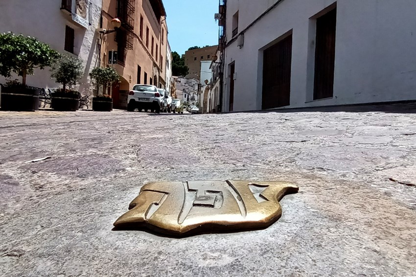 Mediante un concepto y diseño original, estas placas metálicas, colocadas en el suelo en la entrada de cada judería, representan mediante caracteres del alfabeto hebreo las tres letras que forman el nombre de Sefarad en esta lengua y, al mismo tiempo, la silueta de la península ibérica. En Sagunto estas placas fueron instaladas en julio de 2020.