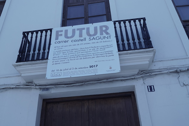 En esta ocasión, y en una fecha diferente, coincidiendo con el festival Sagunt a Escena, el colectivo ha propuesto “colgar” su exposición FUTUR en los balcones de la calle Castillo, con el objetivo de sacarla del espacio expositivo cerrado y que sean las piezas las que se aproximen a la sociedad, facilitando de esta forma el diálogo entre los ciudadanos y las obras.
