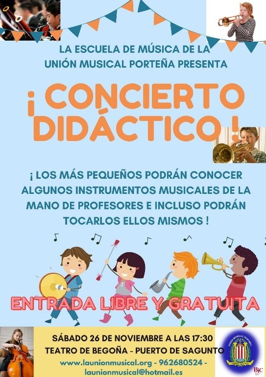 La Unión Musical Porteña, a través de su escuela de música, ofrecerá este sábado, 26 de noviembre, un concierto didáctico infantil gratuito. Será en el Teatro de Begoña de Puerto de Sagunto (calle Progreso, 9) a las 17:30 horas y la entrada será libre hasta completar aforo.