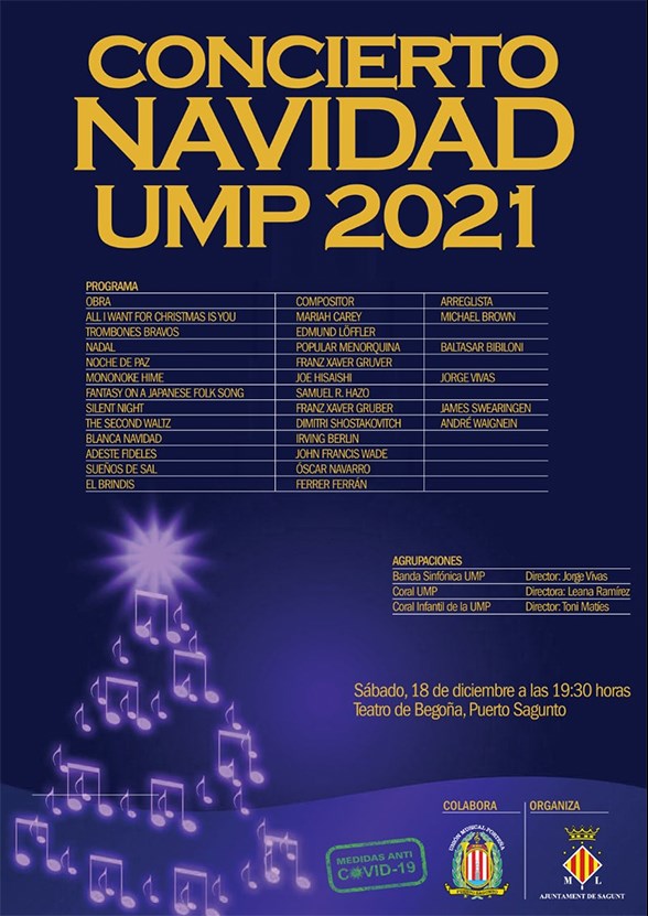 La Unión Musical Porteña celebra su tradicional concierto de navidad este sábado, 18 de diciembre, en el Teatro de Begoña de Puerto de Sagunto a las 19.30 horas. Las agrupaciones encargadas del concierto son la Banda Sinfónica, dirigida por Jorge Vivas; la Coral, dirigida por Leana Ramírez; y la Coral Infantil, dirigida por Toni Matíes.