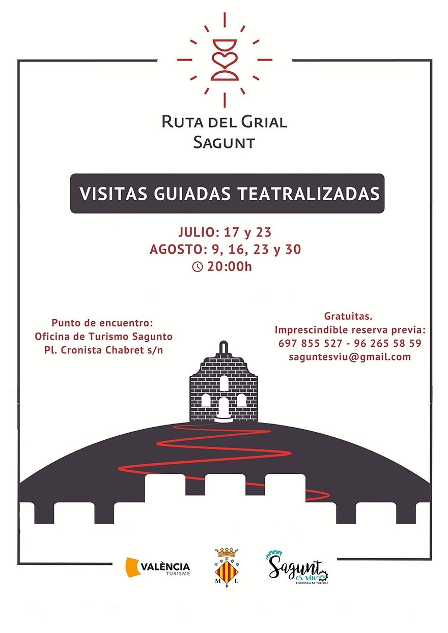 La primera de las propuestas será una visita guiada teatralizada gratuita de la Ruta del Grial en Sagunto esta tarde y que partirá desde la oficina de Turismo de la plaza Cronista Chabret a las 20 horas. Para poder disfrutar de esta actividad, que se repetirá el jueves 23 de julio y el 9, 16, 23 y 30 de agosto, habrá que reservar plaza en el 697 855 527, 96 265 58 59 o a través del correo electrónico