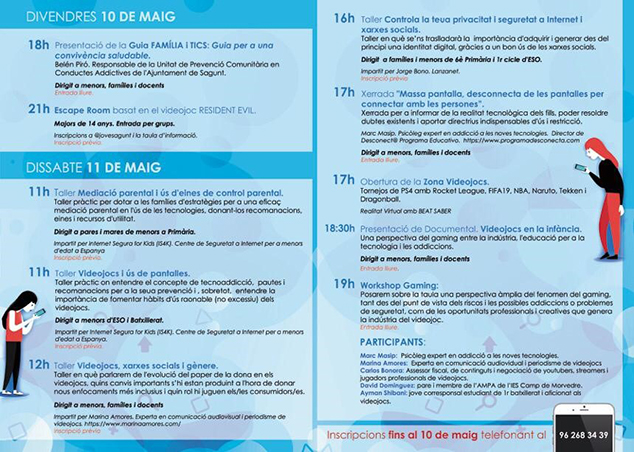 Una hora después, se presentará el documental que ha preparado el experto en comunicación Carles López, “Videojuegos en la infancia”, una perspectiva del gaming entre la industria, la educación para la tecnología y las adicciones. Y a las 19 horas, la mesa redonda o Workshop Gaming, con Marc Masip, Marina Amores y otros invitados. Se pondrá sobre la mesa una perspectiva amplia del fenómeno del gaming tanto desde el punto de vista de los riesgos y las posibles adicciones o problemas de seguridad como de las oportunidades profesionales y creativas que genera la industria del videojuego. En esta mesa redonda participarán el psicólogo experto en adicción a las nuevas tecnologías y director de Desconect@ Programa Educativo, Marc Masip; la experta en comunicación audiovisual y periodismo de videojuegos, Marina Amores; el asesor fiscal, de contenidos y negociación streamer y jugador profesional de videojuegos, Carlos Bonora; el miembro del AMPA del IES Camp de Morvedre, David Domínguez; y el estudiante de 1º de bachillerato y aficionado a videojuegos, Ayman Shibani.