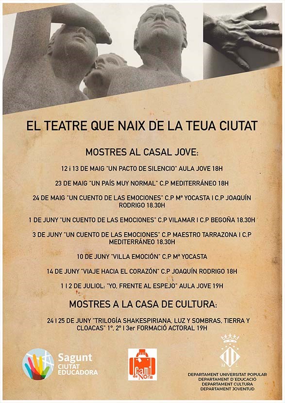 Las muestras de teatro del programa ‘El teatre que naix de la teua ciutat’ de la Escuela Municipal de Teatro ya están en marcha. Esta actividad la organiza la Universidad Popular junto a los departamentos de Educación, Cultura e Infancia y Juventud del Ayuntamiento de Sagunto.