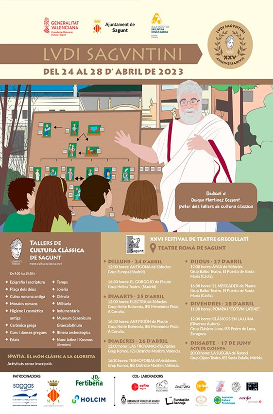 Los Ludi Saguntini vuelven en 2023 entre los días 24 y 28 de abril para celebrar su vigesimoquinto aniversario, incluyendo el XXVI Festival de Teatro Grecolatino, que tendrá su acto de clausura el 17 de junio. De forma simultánea, se llevarán a cabo diversos talleres didácticos de cultura clásica, organizados por la Asociación Ludere et Discere. Paralelamente, se realizarán actividades organizadas por la Asociación Prósopon Sagunt, solo para el alumnado inscrito en el Festival de Sagunt.