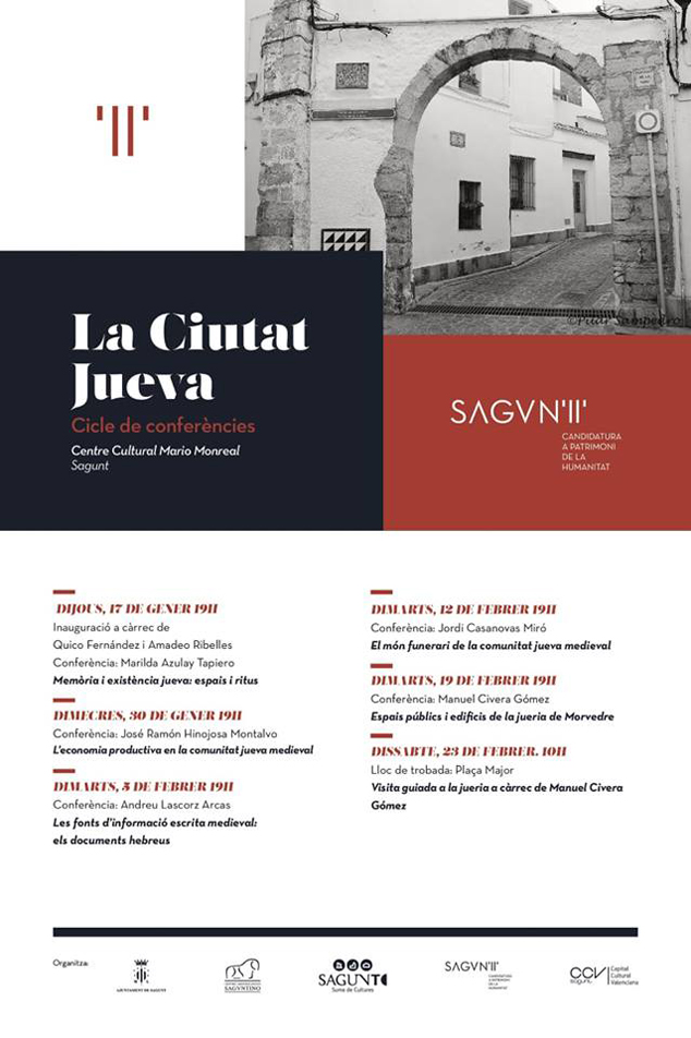 El Centro Cultural Mario Monreal acoge mañana, 17 de enero, la primera de las cinco conferencias que bajo el título de ‘La Ciutat Jueva’ pretenden dar a conocer la historia y el patrimonio judío de Sagunto. Esta iniciativa está organizada por la delegación de Cultura del Ayuntamiento de Sagunto y el Centro Arqueológico Saguntino.