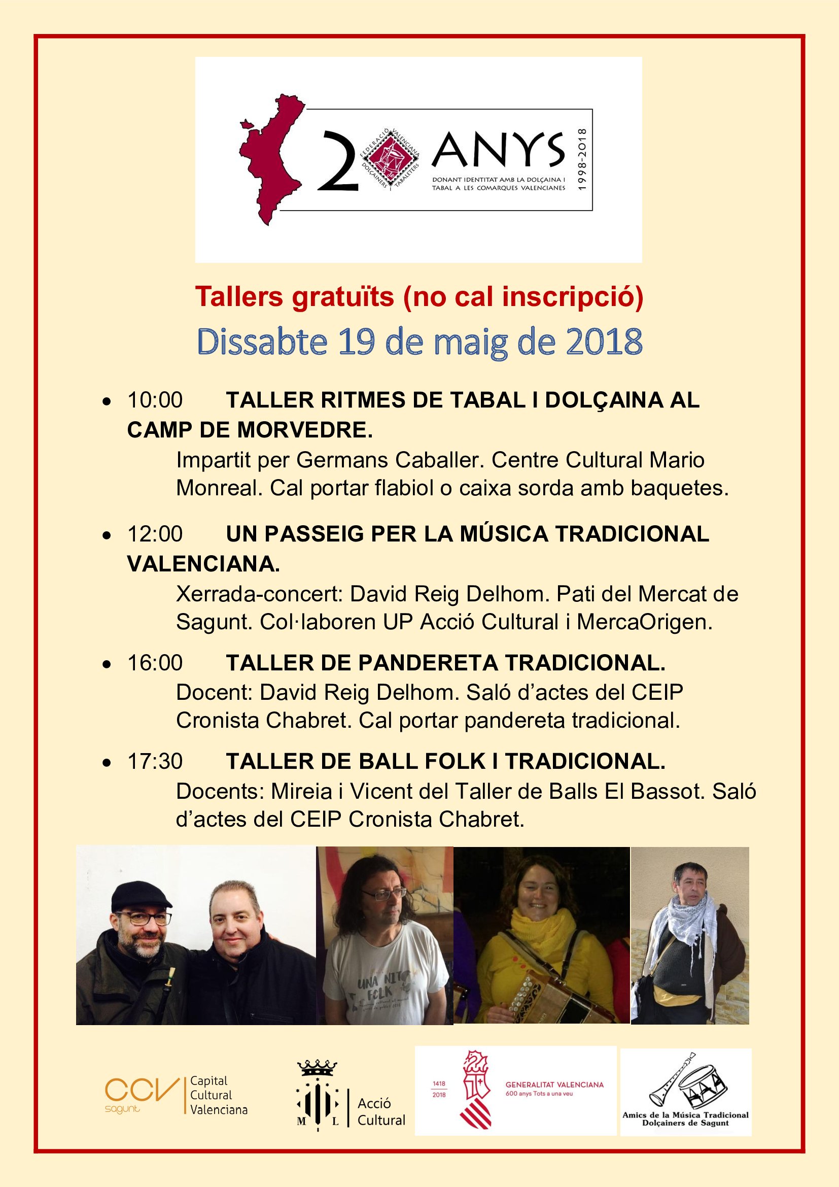 Entre los actos más relevantes, destaca la mesa redonda que tendrá lugar el viernes, 18 de mayo, a las 19 horas en la Casa Capellà Pallarés sobre el “Presente y perspectivas de futuro de la música valenciana de raíz”, en la que participarán Antoni de la Asunción, Ximo Caffarena, Josemi Sánchez y Vicent Torrent y moderará Eduard Caballer. Por otro lado, el sábado, 19 de mayo, durante todo el día tendrán lugar diferentes talleres sobre música tradicional en el Centro Cultural Mario Monreal a las 10 horas (Ritmos de tabal y dulzaina), en el CEIP Cronista Chabret a las 16 (Pandereta tradicional) y a las 17.30 horas (Baile folk y tradicional), así como una charla-concierto de música tradicional valenciana a las 12 horas en el patio del Mercado de Sagunto.