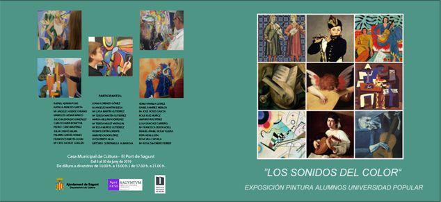 Un total de 33 alumnos del Curso de Dibujo y Pintura de la Universidad Popular inauguraron la exposición artística Los sonidos del color en La Casa Municipal de Cultura del Puerto de Sagunto el miércoles 5 de junio a las 19 h. A la inauguración asistieron el profesorado, los alumnos y sus familiares. La muestra forma parte del programa que lleva a cabo la delegación de Cultura del Ayuntamiento de Sagunto y se podrá visitar hasta el 30 de junio de lunes a viernes de 10 a 13 horas y de 16 a 21 horas.