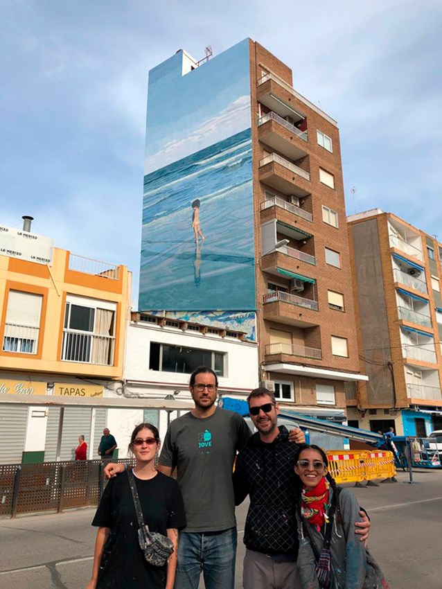 El concejal delegado de Juventud e Infancia, Guillermo Sampedro, y el coordinador artístico del festival, Vicent Sánchez ‘Bize’, han visitado junto a las artistas el resultado de este primer trabajo que da inicio a la edición del presente 2022 y que se empezó a pintar el pasado viernes en la pared medianera del edificio de la avenida Mediterráneo que hace esquina con la calle Hernán Cortés.
