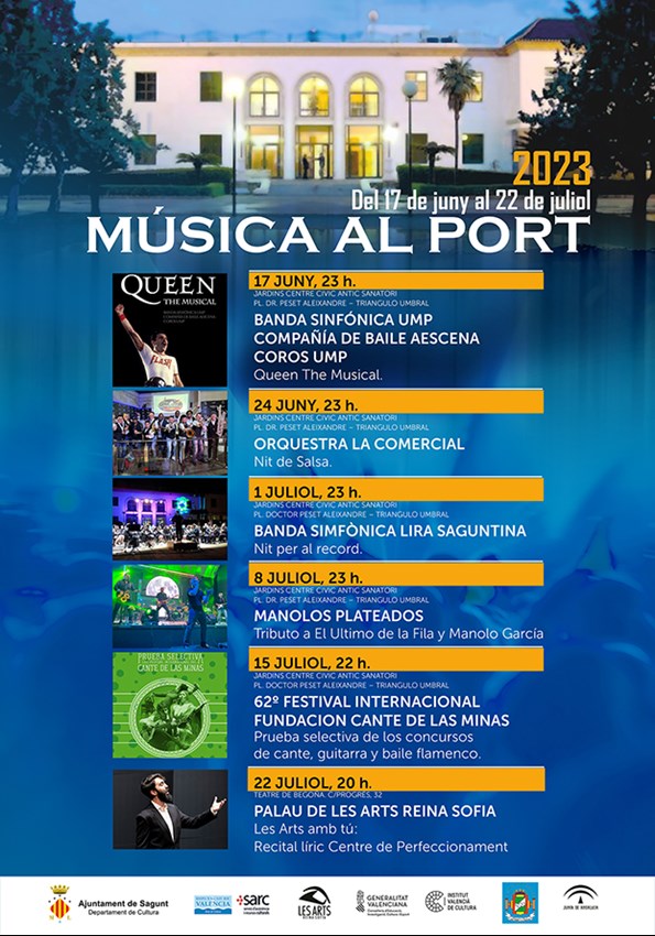 Música al Port es un festival de acceso gratuito y al aire libre que está organizado por el Ayuntamiento de Sagunto, a través de la Concejalía de Cultura. Los conciertos se celebrarán todos los sábados a las 23 horas en los jardines del Centro Cívico Antiguo Sanatorio, exceptuando la última actuación que será el sábado 22 de julio a las 20 horas en el Teatro de Begoña.