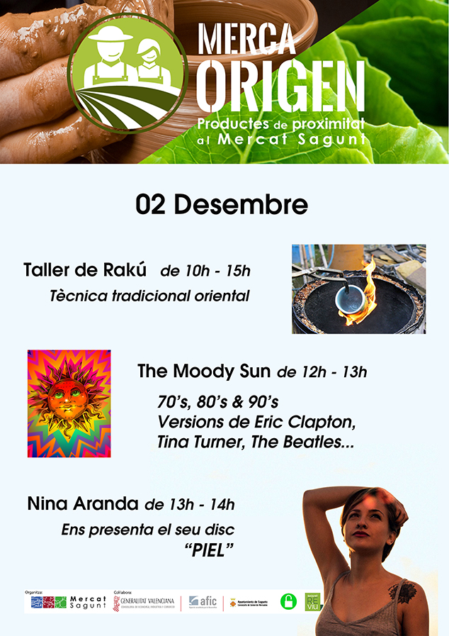 Como cada sábado por la mañana, este 2 de diciembre MercaOrigen vuelve al mercado municipal de Sagunto. Se ofrecerá una buena diversidad de productos artesanales como por ejemplo aceite de Viver, confituras, patés, cervezas artesanales, verduras ecológicas de l'Horta, joyería, cosmética, etc. Se trata de productos frescos y de calidad comprados directamente a los productores. Además, continúa la oferta de cultura y arte en directo, en este caso los asistentes podrán disfrutar con la participación de artistas de nuestra localidad.