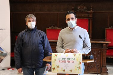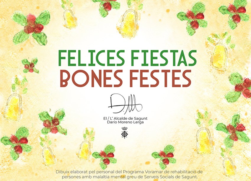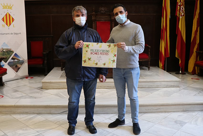 El alcalde de Sagunto, Darío Moreno, ha presentado este lunes la felicitación navideña del Ayuntamiento para las fiestas de este año. Lo ha hecho acompañado de José Miguel, usuario del programa Voramar que ha ganado el concurso de ideas en el que ha participado junto a compañeros y compañeras de este programa de Servicios Sociales.
