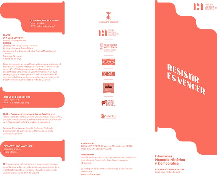 Sagunto tendrá sus primeras jornadas dedicadas a la Memoria Histórica y Democrática entre el 1 de octubre y el 19 de noviembre, bajo el lema Resistir es vencer. A lo largo de ese mes y medio que arrancará este sábado se sucederán numerosas actividades en torno a este mismo eje temático como conferencias, mesas redondas, presentaciones de libros, webseries y cómics, cine documental, teatro y visitas guiadas.