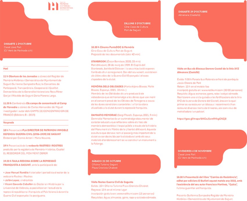 La Concejalía de Memoria Histórica y Democrática del Ayuntamiento de Sagunto ha organizado las actividades de estas jornadas con la colaboración de la Conselleria de Participación, Transparencia, Cooperación y Calidad Democrática; la Diputación provincial de Valencia; la Federación Valenciana de Municipios y Provincias; la Coordinadora de Asociaciones para la Memoria Democrática; y de la Asociación Cultural Nautilus.