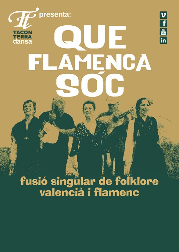 Que flamenca sóc, es un espectáculo de danza realizado por la compañía ‘Taconterra Danza’, en el que desde una visión fresca y creativa, se ofrece un acercamiento entre el folclore valenciano y los palos más folclóricos del flamenco. Así pues, a ritmos de albaes, fandangos, bulerías, coplas, fábulas o danzas, los componentes valencianos de ‘Taconterra Danza’ nos envolverán con una armonía perfecta, lo más conocido del arte flamenco y lo más popular de nuestra tradición, convirtiendo las dos músicas en una.