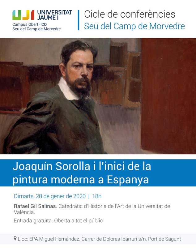 La concejalía de Cultura ha programado para mañana, 28 de enero, la conferencia ‘Joaquín Sorolla y el inicio de la pintura moderna en España’, de Rafael Gil Salinas, catedrático de Historia del Arte de la Universidad de València. La charla forma parte del ciclo de conferencias de la sede de la Universitat Jaume I del Camp de Morvedre y del convenio entre la UJI y Ayuntamiento de Sagunto, a través de la Universidad Popular. Comenzará a las 18.00 horas de mañana, 28 de enero, en la Escuela Permanente de Adultos Miguel Hernández (EPA).