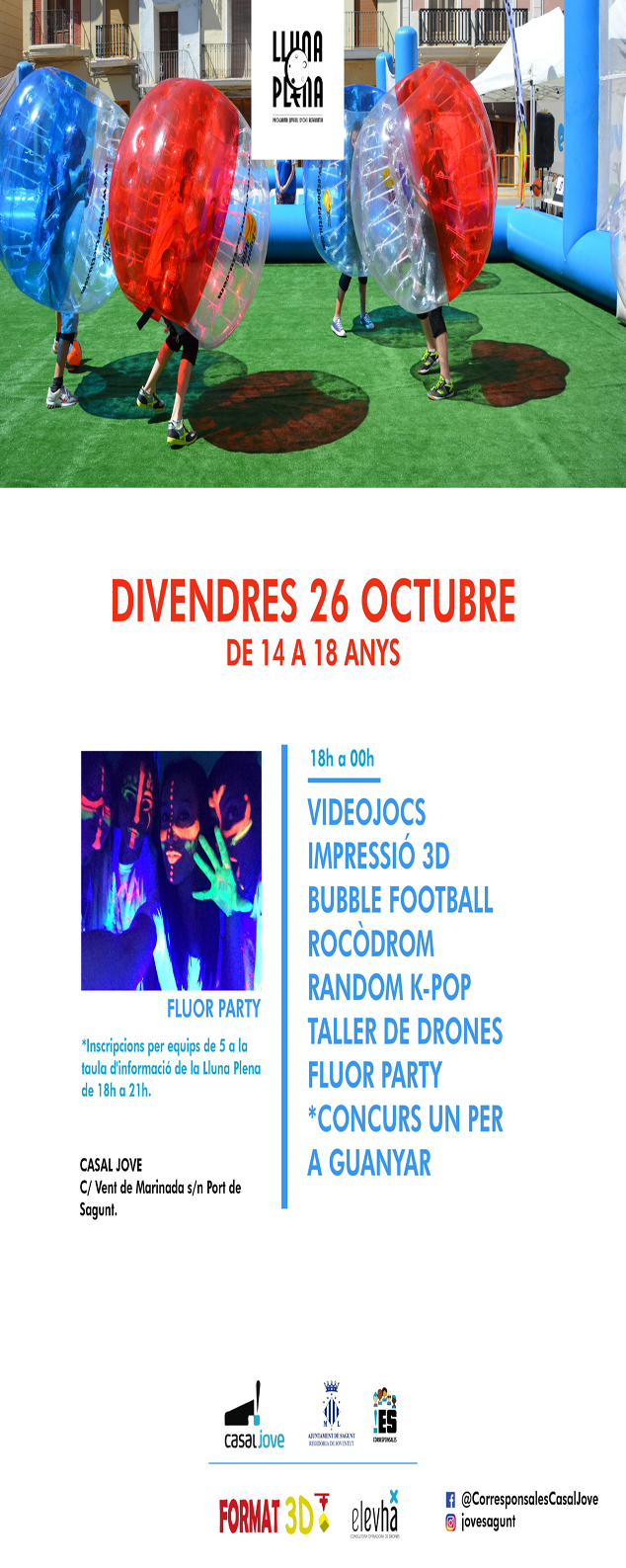 ​El próximo sábado, 27 de octubre, regresará Lluna Plena con actividades y talleres para los más jóvenes, que tendrán lugar en el Casal Jove de Puerto de Sagunto, de 18 a 24 horas. El evento, organizado por la concejalía de Juventud, contará con juegos, torneos y actividades que se desarrollarán por la tarde y por la noche.