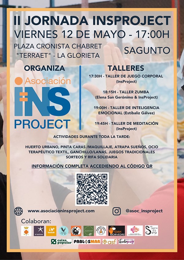 El viernes 12 de mayo se celebrará la II Jornada Insproject en la plaza Cronista Chabret a partir de las 17 horas. Este evento será en formato de puertas abiertas y con el objetivo principal de que se convierta en un espacio de visibilización, convivencia e intercambio de experiencias para todas las personas, dado que la intención es conseguir que, personas con y sin discapacidad puedan compartir un día de actividades socio-culturales. Esta jornada cuenta con la colaboración del departamento de Servicios Sociales del Ayuntamiento de Sagunto.