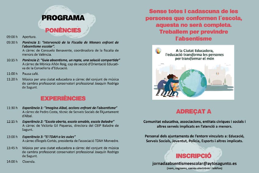 Las personas interesadas en participar pueden enviar un correo con sus datos (nombre, apellido, profesión) a: jornadaabsentismeescolar@aytosagunto.es