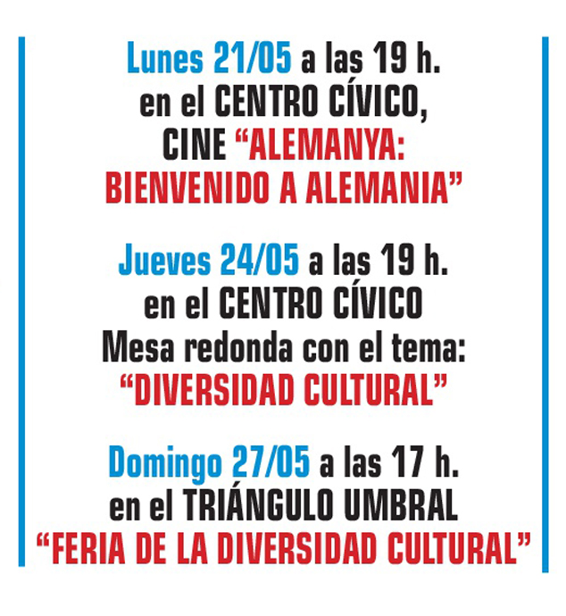 Los actos que engloban esta celebración serán la proyección de la película Alamanya: bienvenido a Alemania (Alemania, 2011) del cineasta Yasemin Samdereli, en el Centro Cívico el lunes, 21 de mayo, a las 19 horas; una mesa redonda sobre diversidad cultural, el jueves, 24 de mayo, a las 19 horas también en el Centro Cívico, donde según han destacado desde la Federación “queremos que participen personas que llevan en el núcleo de Puerto de Sagunto desde su fundación, cuando se acogió a gentes de toda España, o al menos tengan experiencias de aquellos momentos” y han adelantado que participará una señora de 99 años con la experiencia que sus padres le contaron de la fundación de Puerto de Sagunto; y, por último, se celebrará la Feria de la Diversidad Cultural el domingo, 27 de mayo, a partir de las 17 horas en el parque Juan Carlos I (Triángulo Umbral), la cual quieren desde la Federación que sea un foro de convivencia de vecinos y vecinas para que nos conozcamos.
