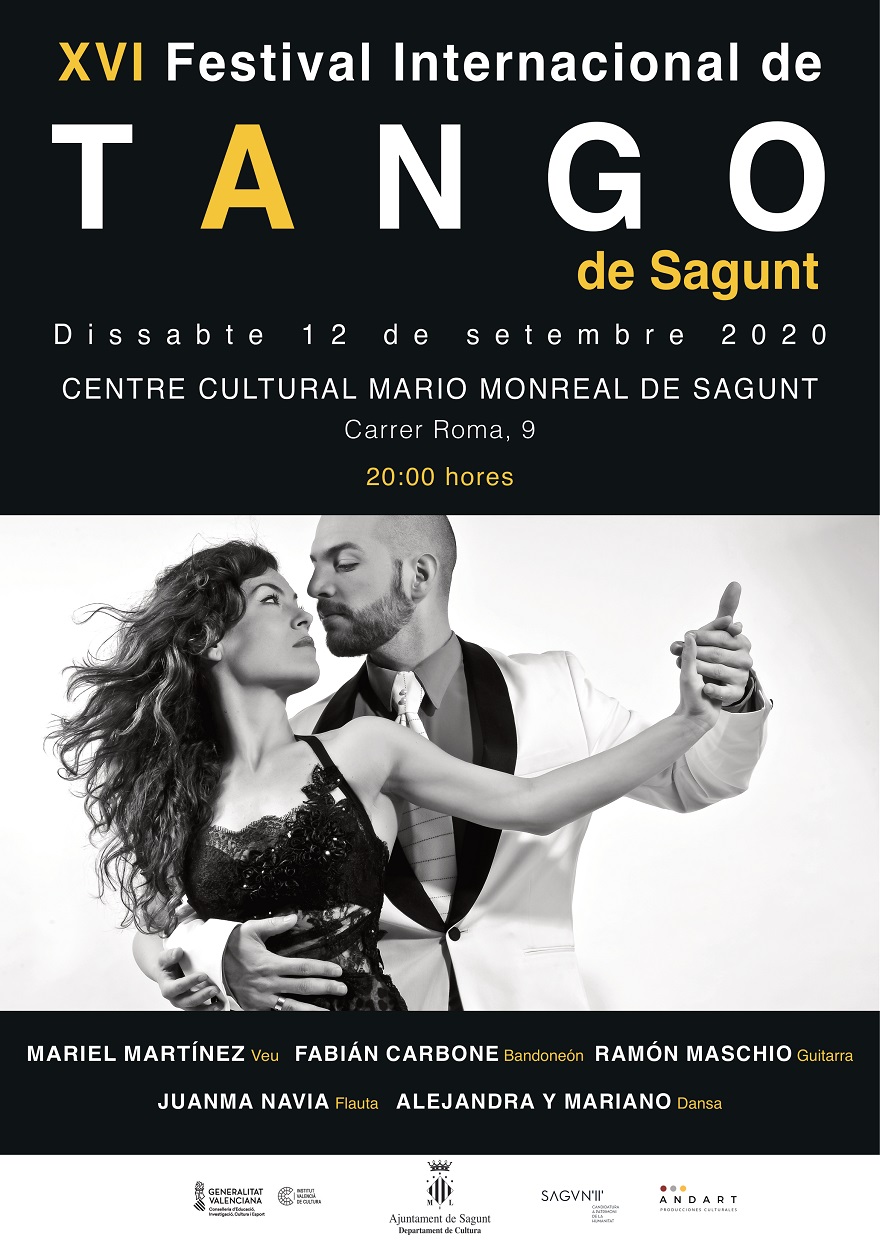 Sagunto celebra un año más el Festival Internacional de Tango, que llega a la decimosexta edición. El próximo sábado 12 de septiembre, a las 20 horas, el Centro Cultural Mario Monreal acogerá este evento de la Agenda cultural de otoño 2020 como es habitual con las medidas de seguridad contempladas en el protocolo de prevención de la Covid-19.