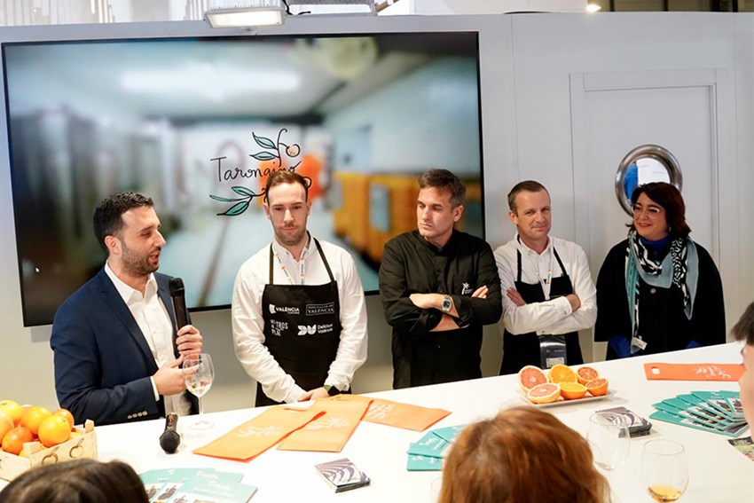 Por otra parte, también se ha presentado la gastronomía de la ciudad, en esta ocasión en forma de cata del vino de naranja de Sagunto, Tarongino, de la empresa local Naranjas Ché, en la zona de l’Exquisit Mediterrani de Turisme Comunitat Valenciana. Durante la cata, los asistentes han podido conocer la ciudad y su relación con este vino. Los empresarios Jaime Fernández y Guillermo Antelo han dado a conocer las diferentes variedades de naranjas que producen de manera sostenible y ecológica. Esto ha permitido internacionalizar el vino de naranja del municipio en países como Japón, China y los países nórdicos. A través diversas imágenes y las explicaciones, las personas asistentes se han deleitado con la cata, además degustando tres variedades del vino de naranja, el de pomelo y el espumoso, conociendo así como se produce este producto, mediante la fermentación de la naranja.