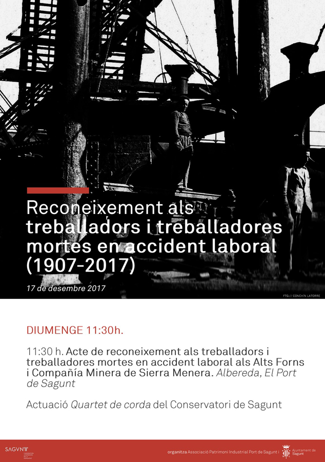 El Ayuntamiento de Sagunto ha organizado para este domingo un acto de homenaje a los 156 trabajadores y trabajadoras que fallecieron en un accidente laboral desde 1907 hasta la actualidad. En este período se incluye a quienes perdieron la vida trabajando para la Compañía Minera Sierra Menera, Altos Hornos y empresas auxiliares. En el acto institucional, que forma parte de los actos del centenario de la siderurgia, se descubrirá una placa de acero con los nombres de todas las víctimas. La cita es en la Alameda de Puerto de Sagunto a las 11.30 horas.