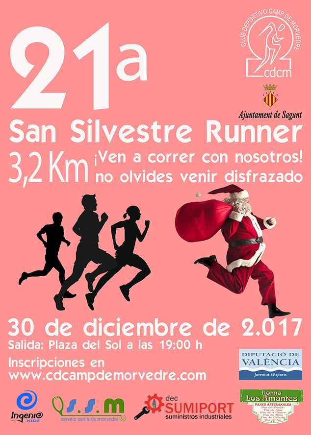 La entrega de trofeos en este caso será a partir de las 19.30 h. Debido al mayor tamaño del centro urbano de Puerto de Sagunto, ésta carrera tendrá mayor distancia de recorrido que su homónima saguntina: 3,2 km. La línea de salida, y la de meta, de la San Silvestre Runner será la Plaza del Sol. Se trata de una carrera que, al igual con la homónima de Sagunto, tiene una sola modalidad debido a su carácter familiar abierto. Las inscripciones pueden realizarse en www.cdcampdemorvedre.es.