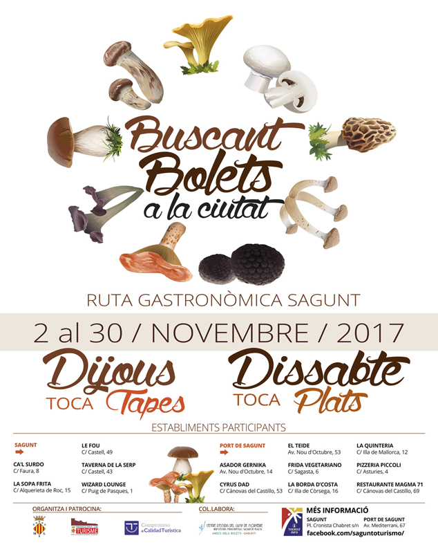 Las delegaciones de Turismo y Medio Ambiente del Ayuntamiento de Sagunto han trabajado conjuntamente para incluir esta novedosa edición de la ruta de la tapa en la programación de las Jornadas Micológicas del Camp de Morvedre, organizadas por el Grup d’estudis mediambientals “Salvador Vilalta”, integrado en el Centre d’Estudis del Camp de Morvedre, y ‘Amics dels Bolets’.