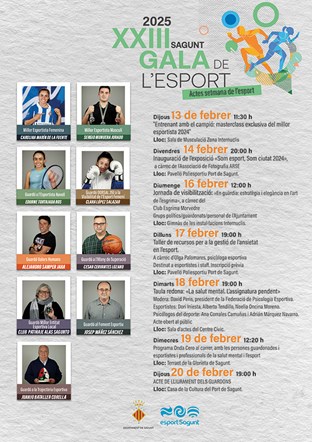 La programación comenzará el jueves 13 a las 11.30 horas con un entrenamiento con Sergio Munuera, mejor deportista masculino del 2024, en la sala de musculación del Polideportivo Municipal (internúcleos). Luego, el viernes 14 se inaugurará a las 20 horas la exposición ‘Som esport, Som ciutat 2024’ en el Pabellón Polideportivo Puerto de Sagunto. La exposición es a cargo del Grupo Fotográfico ARSE.
