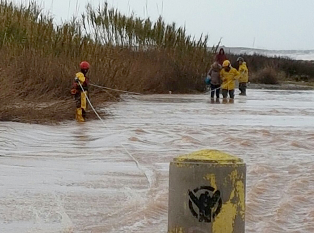 Los bomberos ya han tenido que acudir a sacar del delta del río a dos personas que, al intentar cruzar hacia la orilla de Sagunto, han visto que no podían debido al agua. Mediante la ayuda de unas cuerdas los bomberos han conseguido ayudarlos a cruzar.