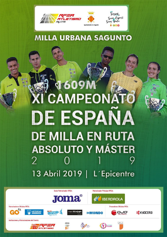 El sábado 13 de abril Sagunto será la sede del XI Campeonato de España de Milla en Ruta en las categorías de Absoluto y Máster. A partir de las 18 horas y hasta las 21 horas aproximadamente irán sucediéndose en la avenida Fausto Caruana diferentes pruebas donde se elegirán los y las mejores atletas de España en cada categoría. El recorrido de estas pruebas será un circuito cerrado de 1.609 metros y recibirá a más de 200 de los mejores atletas de España, muchos de ellos locales como por ejemplo Laura Méndez, Abderramán El Kayhami, Cande Iniesta y Juanjo Mestre.