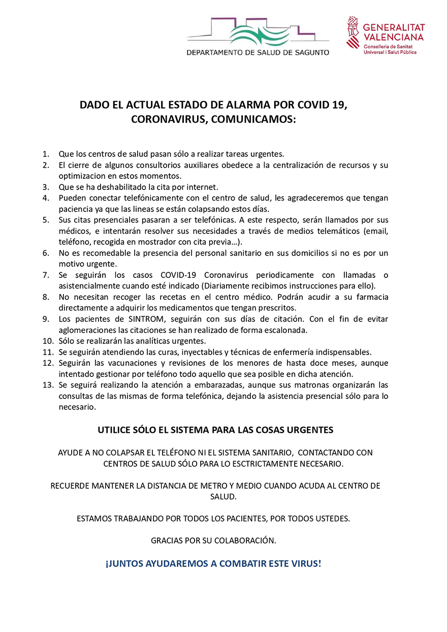 La delegación de Sanidad y Consumo del Ayuntamiento de Sagunto ha hecho público el comunicado que ha difundido el Departamento de Salud de Sagunto, dependiente de la Generalitat Valenciana, sobre la organización de los centro de salud dado el actual estado de alarma por COVID-19:​​​