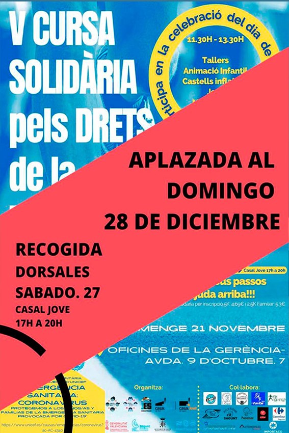 La V Carrera Solidaria por los Derechos de la Infancia a favor de UNICEF, que se celebraba este domingo 21 de noviembre, se aplaza al próximo domingo 28 de noviembre de 2021 a causa de la predicción meteorológica que prevé lluvias para todo el día, con un 85% de probabilidad. Esta actividad la organiza la concejalía de Juventud e Infancia del Ayuntamiento de Sagunto.