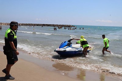 El simulacro ha consistido en el rescate de dos víctimas: una consciente y la otra se encontraba totalmente inconsciente en el agua. Una vez ha sido avistada desde la torre de control, tanto el grupo de socorrismo y salvamento marítimo como el dispositivo de policías locales se han coordinado a la perfección para realizar el rescate. La moto acuática del servicio de socorrismo y la embarcación de la Policía Local han logrado rescatar a las víctimas y se ha habilitado una zona de seguridad que ha permitido que la moto acuática la trasladara hasta la orilla, donde, entre otras medidas, se le han realizado ejercicios de reanimación cardiopulmonar y posteriormente, han trasladado al hospital con la ambulancia a la víctima inconsciente.