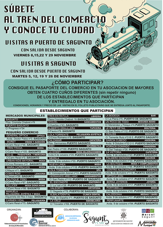 Los martes del mes de noviembre, los mayores de Puerto de Sagunto podrán visitar Sagunto a través del ‘Tren del Comercio’, que los recogerá y guiará por el tejido comercial de Sagunto, visitando el barrio judío, el Castillo y el Teatro Romano, todo ello acompañados por una guía especializada, y culminando su visita en el Mercado Municipal de la ciudad.