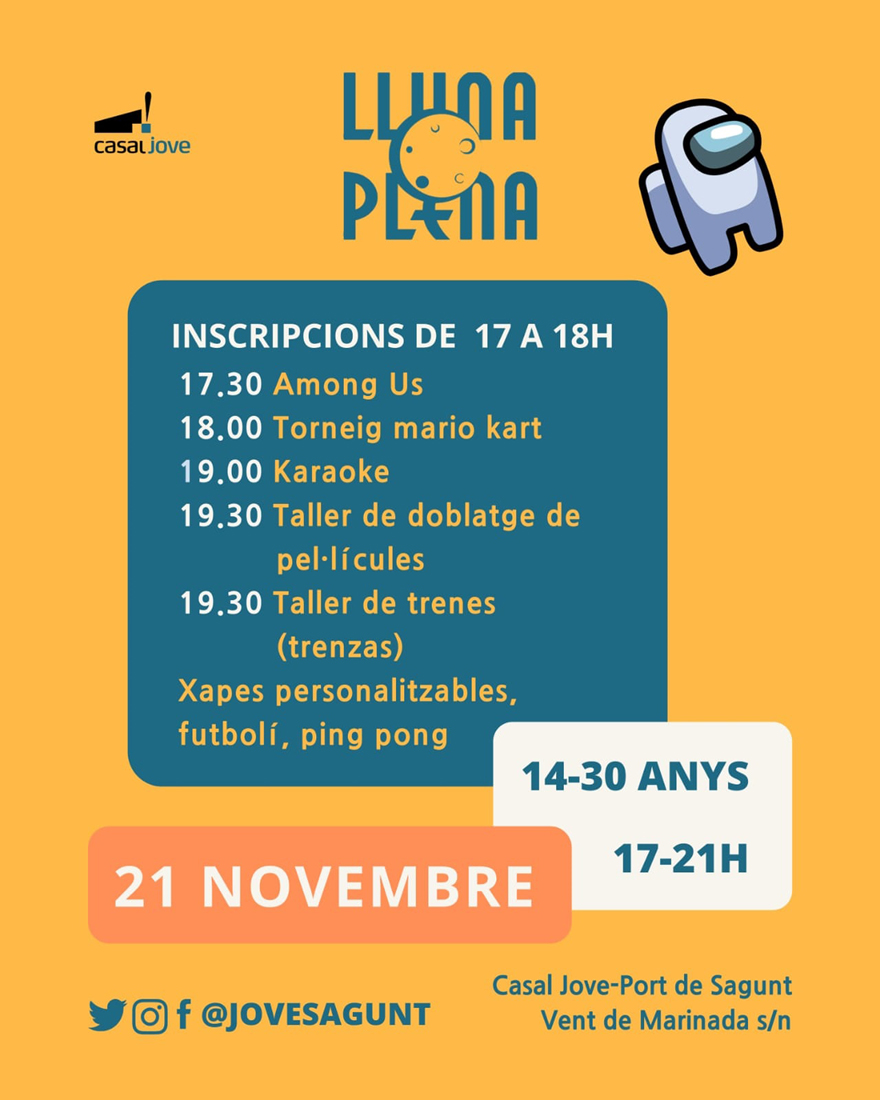 Las actividades que se desarrollarán durante el Lluna Plena de esta semana han sido todas propuestas por el equipo de corresponsales. Es decir, ocio de jóvenes para jóvenes. Entre las actividades podremos encontrar, en primer lugar, torneos de Mario Kart y de Among Us con la finalidad de facilitar encuentros de aficionados al juego y organizar partidas conjuntas.