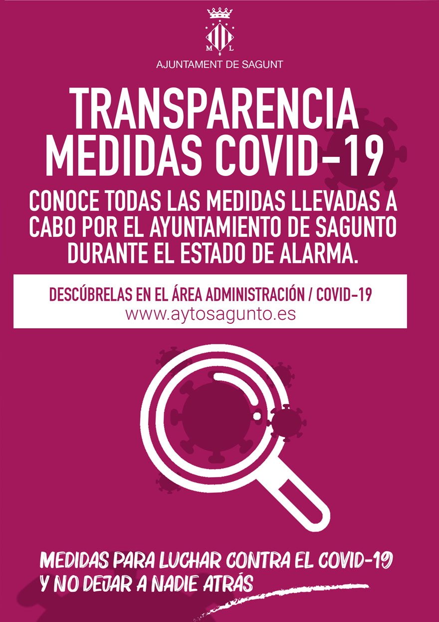 La concejalía de Transparencia del Ayuntamiento de Sagunto ha habilitado una nueva página en la web municipal en la cual se agrupan todas las medidas adoptadas por parte del Ayuntamiento como consecuencia del estado de alarma provocado por la crisis de la COVID-19. Esta información puede encontrarse en la web municipal, a través de la sección ‘Administración’ y en el apartado ‘COVID-19’, o bien clicando en el siguiente enlace: http://www.aytosagunto.es/es-es/ayuntamiento/administracion/covid19/Paginas/medidas-ayuntamiento-covid.aspx.